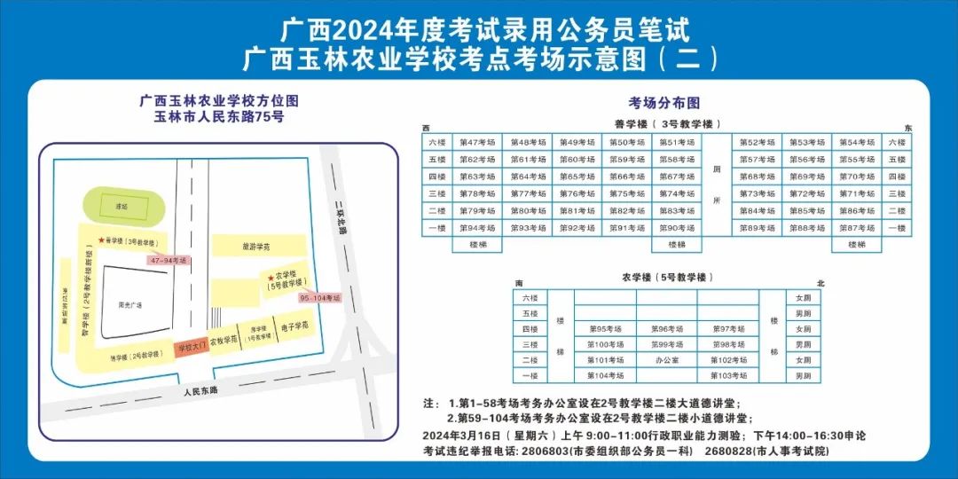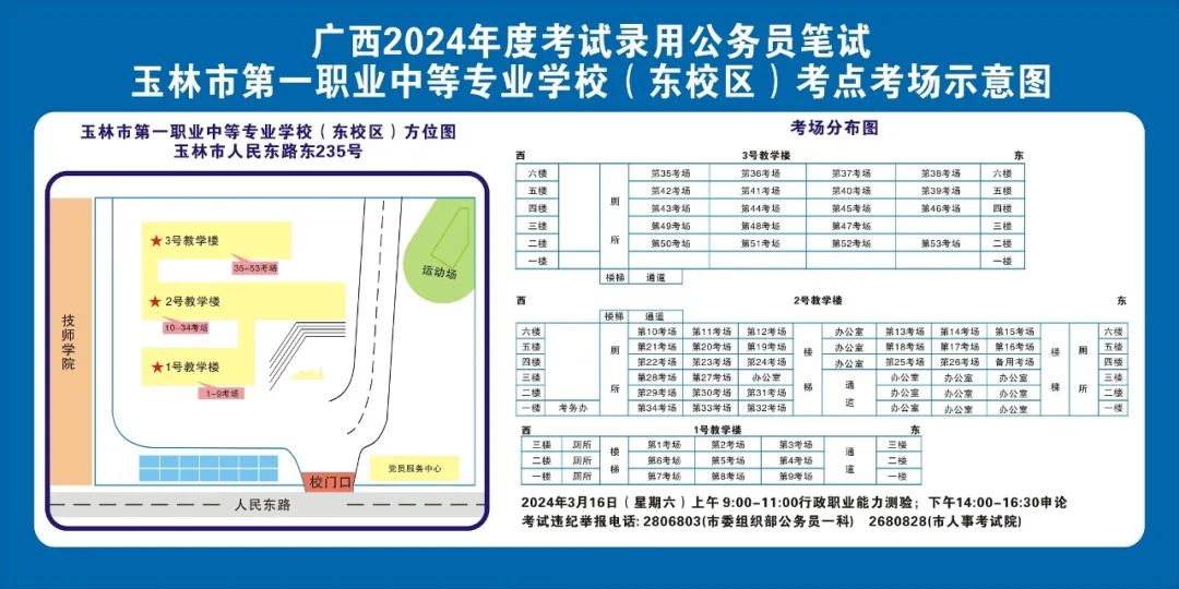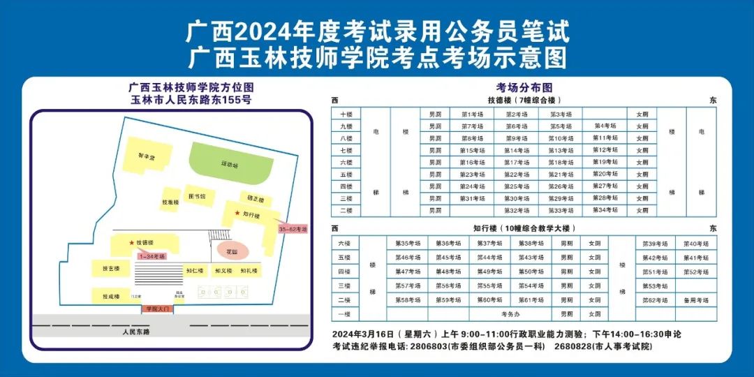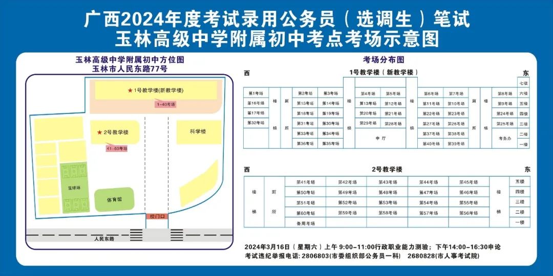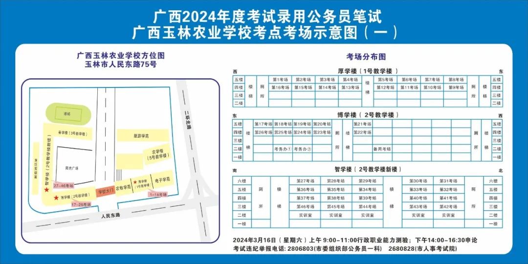 請及時登錄“廣西人事考試網(wǎng)”打印筆試準(zhǔn)考證并妥善保管,仔細(xì)查看準(zhǔn)考證上的考點(diǎn)信息。本次考試玉林考區(qū)共設(shè)10個考點(diǎn),各考點(diǎn)名稱、考點(diǎn)詳細(xì)地址如下: