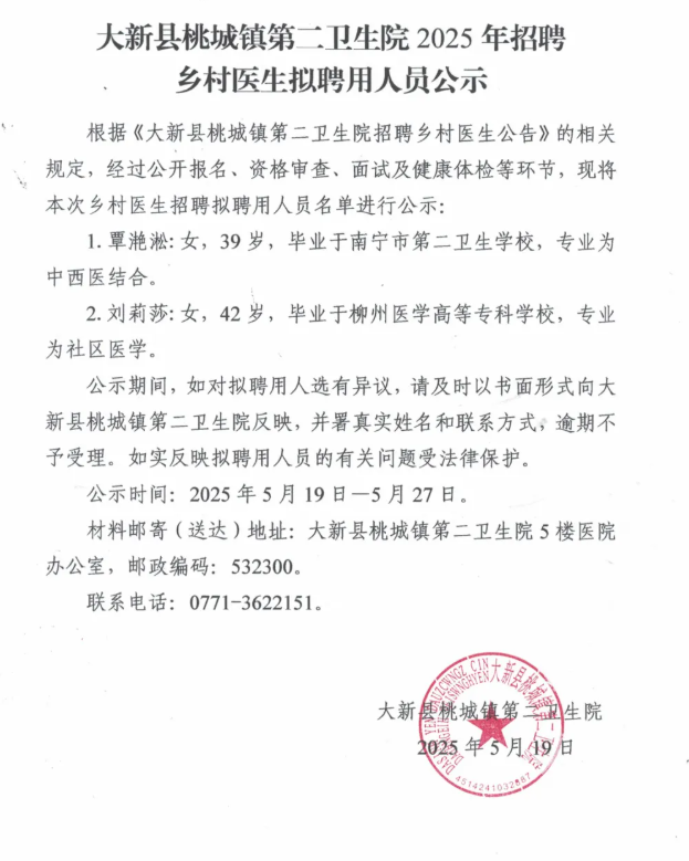 2025年崇左大新縣桃城鎮(zhèn)第二衛(wèi)生院招聘鄉(xiāng)村醫(yī)生擬聘用人員公示