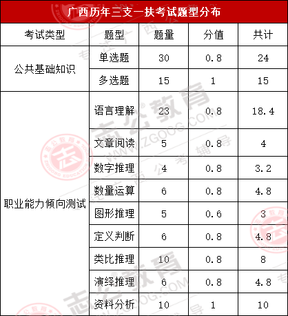 上篇我們寫到,三支一扶的待遇,在廣西這個待遇還算不錯,政策上的支持也非常好,那么預(yù)計(jì)這個月月底出公告的三支一扶,啥時(shí)候筆試呢?2024年廣西三支一扶筆試時(shí)間是7月13日,其筆試科目為《綜合知識》一科,滿分100分?;谕昕忌幕貞?,綜合知識內(nèi)容主要包括公共基礎(chǔ)知識和行測職業(yè)能力測試兩個科目,而各題型的題量及分值如下圖所示: