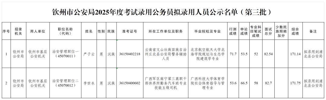 15 欽州市2025年度考試錄用公務員擬錄用人員公示(七)