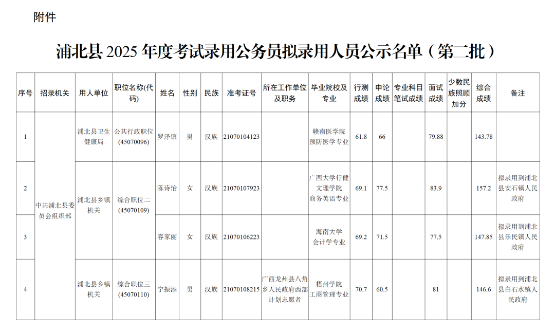 10 浦北縣2025年度考試錄用公務員(參照管理人員)擬錄用人員公示(第一批)