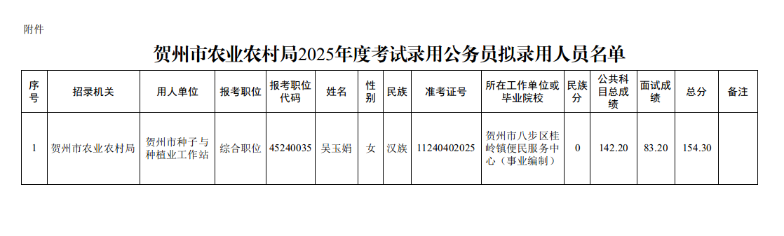 6.12 賀州市農(nóng)業(yè)農(nóng)村局2025年度考試錄用公務(wù)員擬錄用人員名單