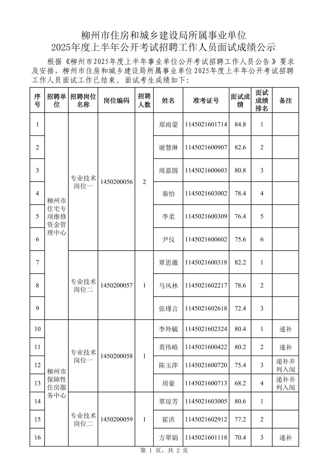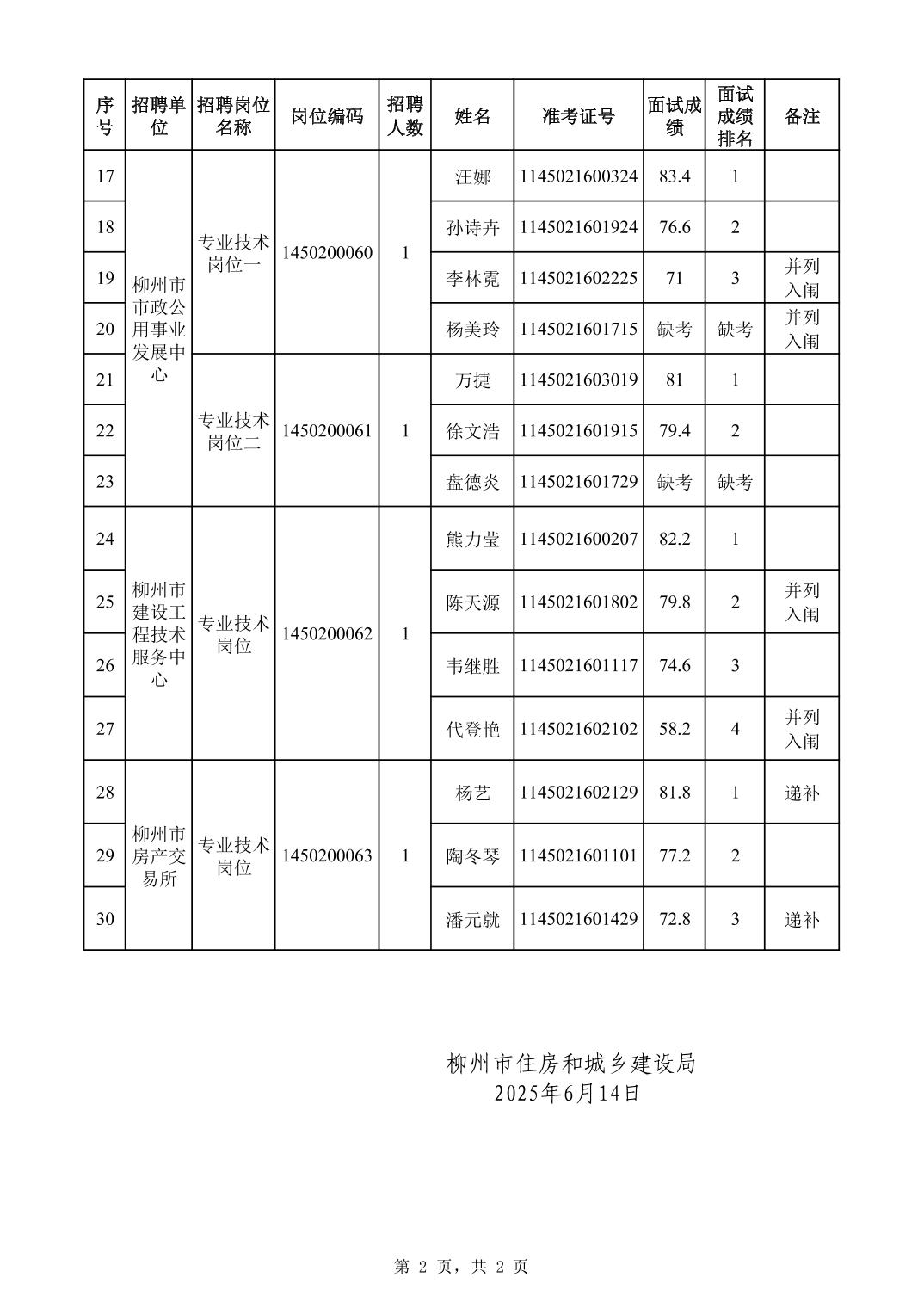 柳州市住房和城鄉(xiāng)建設局所屬事業(yè)單位2025年度上半年公開考試招聘工作人員面試成績公示