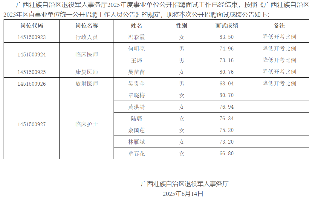 廣西壯族自治區(qū)退役軍人事務廳關(guān)于發(fā)布2025年度事業(yè)單位公開招聘面試成績的公告