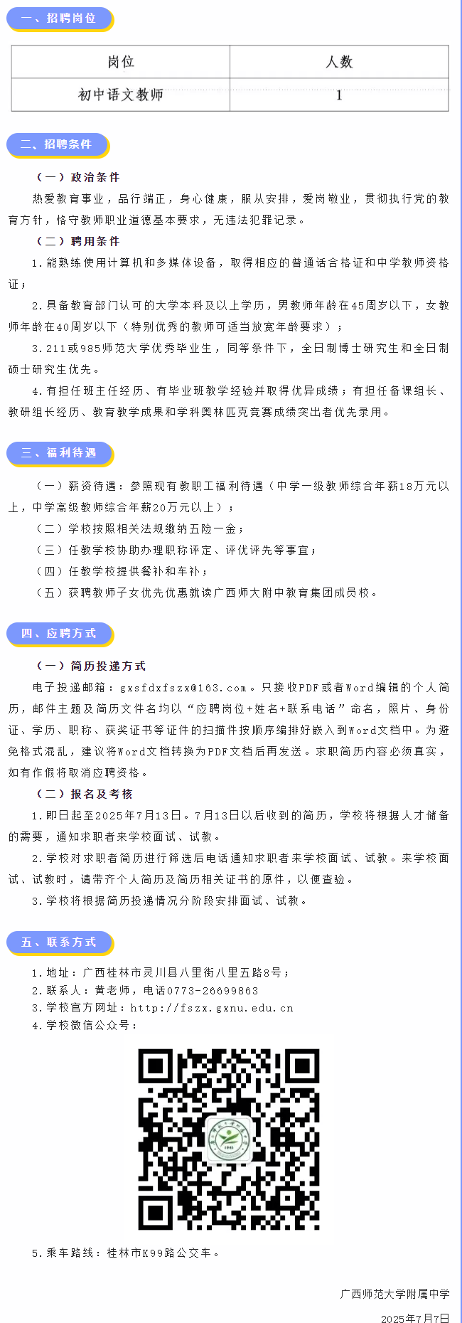 原文標(biāo)題:廣西師范大學(xué)附屬中學(xué)面向全國(guó)急聘初中語(yǔ)文教師1名