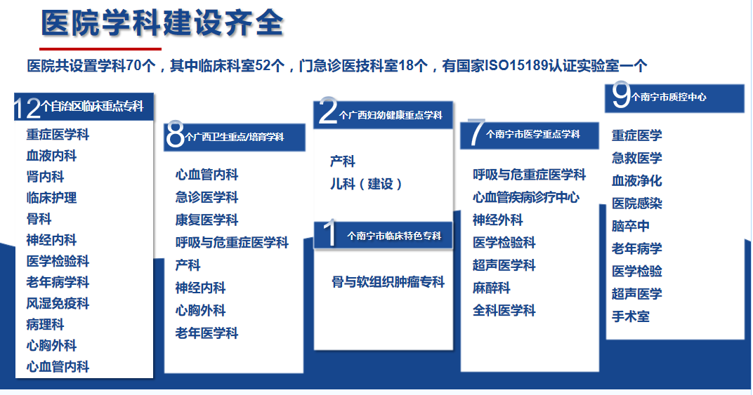 南寧市第一人民醫(yī)院(南寧市兒童先天性心血管疾病研究所、南寧市呼吸道疾病研究所、廣西醫(yī)科大學第五臨床醫(yī)學院、廣西醫(yī)科大學第五附屬醫(yī)院)始建于1914年,是一家擁有百年歷史的國家三級甲等綜合性醫(yī)院。醫(yī)院設有52個臨床病區(qū),18個門診醫(yī)技科室,總開放床位1912張(含分院)。醫(yī)院是國家高級認知中心建設單位及國家神經(jīng)介入建設中心、國家ISO15189醫(yī)學檢驗認證機構,國家聯(lián)盟中心認證的胸痛中心、卒中中心;擁有廣西臨床重點??疲ê嘤?2個、自治區(qū)醫(yī)療衛(wèi)生重點學科(含培育)8個、自治區(qū)婦幼健康服務重點學科(含建設)2個、南寧市醫(yī)學重點學科7個、南寧市臨床特色優(yōu)勢專科1個,南寧市質控中心9個。醫(yī)院是國家衛(wèi)健委創(chuàng)面修復能力建設和繼續(xù)教育中心教學基地、國家級住院醫(yī)師規(guī)范化培訓培訓基地,廣西醫(yī)科大學碩士研究生培養(yǎng)基地,同時是暨南大學共建醫(yī)學教育基地、第十批廣西博士后創(chuàng)新實踐基地;醫(yī)院還具備國家藥物臨床試驗機構資質(含I期研究室);醫(yī)院醫(yī)學實驗中心獲批廣西科技廳重點實驗室“廣西智慧精準醫(yī)學實驗室”,是南寧市衛(wèi)健系統(tǒng)唯一的省級重點建設實驗室。2019年在市委市政府支持下,成立南寧市第一人民醫(yī)院醫(yī)療集團?,F(xiàn)有27家成員單位,形成“1+4+22”(中心醫(yī)院+4家二級醫(yī)院+22家基層衛(wèi)生及養(yǎng)老機構)一體化格局,推行“三二一”運營管理模式,逐步構建全生命周期健康管理鏈。
