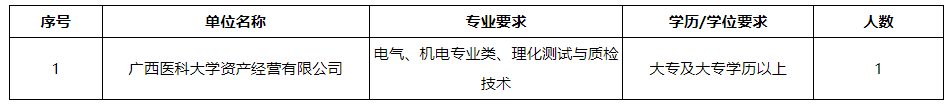 廣西醫(yī)科大學(xué)資產(chǎn)經(jīng)營有限公司(以下簡稱公司)是由廣西醫(yī)科大學(xué)于2011年8月3日獨(dú)資設(shè)立,經(jīng)營管理廣西醫(yī)科大學(xué)經(jīng)營性國有資產(chǎn)和對外投資的股權(quán)。公司依托學(xué)校和附屬醫(yī)院的資源優(yōu)勢,圍繞醫(yī)藥、養(yǎng)老、醫(yī)學(xué)檢驗(yàn)、大健康項(xiàng)目等領(lǐng)域開展投資與合作,積極探索產(chǎn)學(xué)研協(xié)同發(fā)展。根據(jù)工作需要,現(xiàn)面向社會公開招聘工勤崗工作人員,具體招聘事宜如下:
