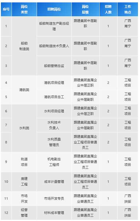 根據(jù)廣西路建集團(tuán)發(fā)展需要,現(xiàn)面向社會公開招聘關(guān)鍵崗位人才,誠邀有志之士與廣西路建集團(tuán)共創(chuàng)美好未來。