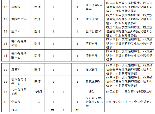 (應(yīng)聘報(bào)名二維碼)同時(shí),按以下要求提供個(gè)人應(yīng)聘材料(電子版)發(fā)電子郵箱:gdyy2817726@163.com(郵件主題請(qǐng)標(biāo)明:“姓名+賀州兩分院”字樣)。應(yīng)屆畢業(yè)生:個(gè)人簡(jiǎn)歷、身份證、就業(yè)推薦表、成績(jī)單、各種獎(jiǎng)項(xiàng)獎(jiǎng)勵(lì)證書(shū)、外語(yǔ)等級(jí)證書(shū)等。非應(yīng)屆畢業(yè)生:個(gè)人簡(jiǎn)歷、身份證、畢業(yè)證、畢業(yè)證備案登記表、學(xué)位證、學(xué)位證備案登記表、職稱(chēng)證、執(zhí)業(yè)證、住院醫(yī)師規(guī)范化培訓(xùn)合格證、工作證明等。報(bào)名時(shí)所提交的申請(qǐng)材料必須真實(shí)、準(zhǔn)確,因報(bào)名時(shí)提交的申請(qǐng)材料不真實(shí)、不完整或錯(cuò)誤填寫(xiě)報(bào)名信息,造成資格審查、面試資格審查不通過(guò)的,后果由報(bào)名人員自行承擔(dān)。(2)資格審核。人事科依據(jù)招聘公告和用人需求規(guī)定的資格條件對(duì)應(yīng)聘人員簡(jiǎn)歷進(jìn)行收集和資格初步審查,經(jīng)招聘工作領(lǐng)導(dǎo)小組審核后,確定符合崗位條件報(bào)名人員名單,由醫(yī)院人事科電話(huà)或短信通知符合條件人員。(3)考核。考核筆試和面試由人事科負(fù)責(zé)組織實(shí)施,協(xié)助部門(mén)為醫(yī)務(wù)部、護(hù)理部、科教科以及用人科室,紀(jì)律監(jiān)督部門(mén)為監(jiān)察室。逾期未參加則視為自愿放棄。(4)試工。通過(guò)考核的非應(yīng)屆畢業(yè)應(yīng)聘人員,須到醫(yī)院試工5天。試工不通過(guò),不予聘用。(5)體檢。體檢工作由廣西壯族自治區(qū)桂東人民醫(yī)院按照有關(guān)規(guī)定統(tǒng)一組織。體檢標(biāo)準(zhǔn)參照《廣西壯族自治區(qū)事業(yè)單位公開(kāi)招聘人員體檢通用標(biāo)準(zhǔn)(試行)》《廣西壯族自治區(qū)事業(yè)單位公開(kāi)招聘人員體檢操作手冊(cè)(試行)》執(zhí)行。體檢不合格或隱瞞真實(shí)情況致使體檢結(jié)果失真的,不予聘用。因體檢不合格空缺崗位的,將按考核的綜合成績(jī),從高到低,順位補(bǔ)充體檢人員。(6)公示和聘用。對(duì)擬聘非應(yīng)屆畢業(yè)應(yīng)聘者在全院范圍內(nèi)進(jìn)行公示,公示期為5個(gè)工作日,公示期滿(mǎn)無(wú)異議按程序辦理聘用手續(xù)。對(duì)公示有異議,經(jīng)核實(shí)影響聘用的,取消其聘用資格;對(duì)反映問(wèn)題難以核實(shí)的暫緩聘用,待核實(shí)清楚后按有關(guān)規(guī)定辦理。