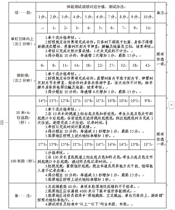 2.體能測試:(1)必考項目:1000米跑;(2)選考項目:①立定跳遠(yuǎn)、原地跳高二選一;②單杠引體向上、俯臥撐二選一;③10米×4往返跑、100米跑二選一;(3)注意事項:體能測試有兩項及兩項以上不得分的視為不合格(標(biāo)準(zhǔn)參照附件)。未按時參加或因身體原因無法測試者,視為自動放棄。